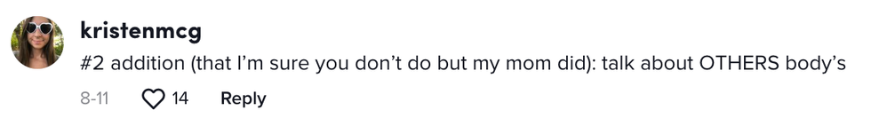 "Number two: I don't comment on their bodies. I discuss the importance of physical exercise and nutrition, but we just don't talk about bodies, and I don't talk about my own in front of them, either."
