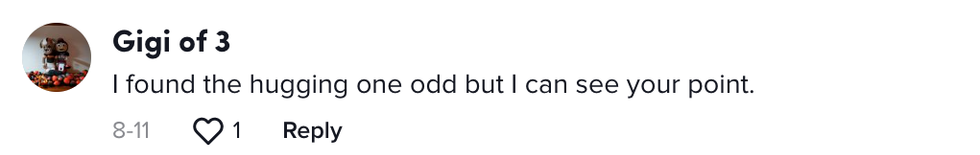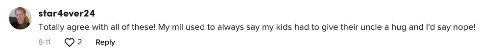 "Number one: I ask for consent when I go to hug my kids. I teach them the importance of bodily autonomy and advocating for themselves, and saying 'no' when they're uncomfortable."