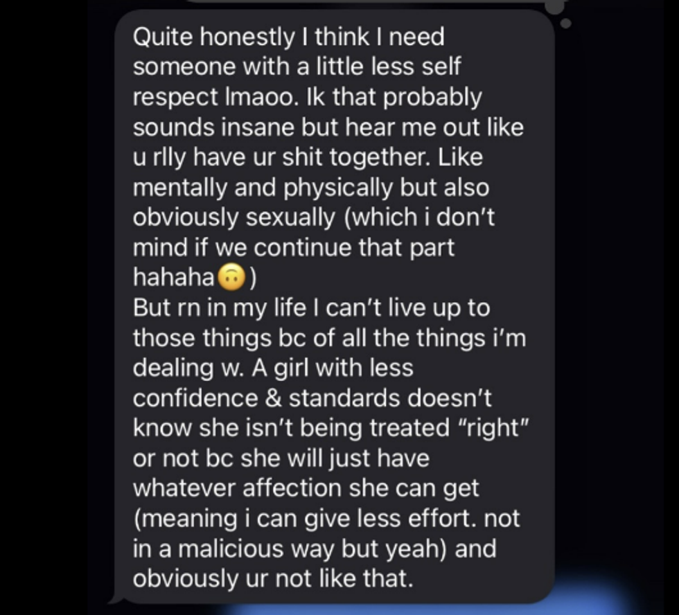 “A girl with less confidence and standards doesn’t know she isn’t being treated ‘right’ or not because she will just have whatever affection she can get (meaning I can give less effort. Not in a malicious way but yeah) and obviously you’re not like that.”