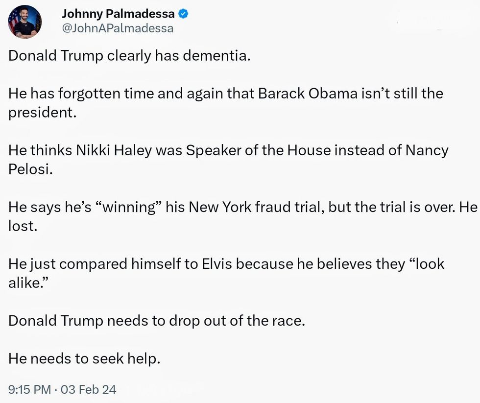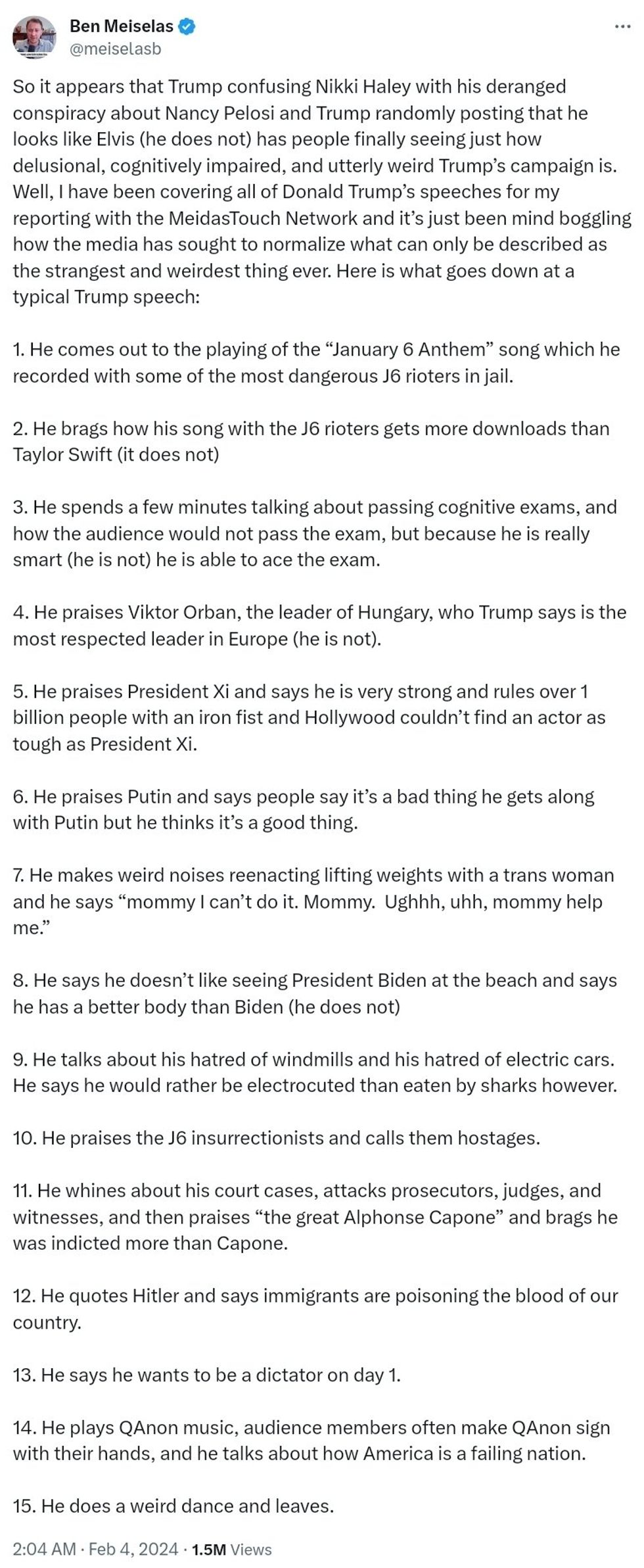 In a rare moment of self-awareness, even Trump acknowledged he brings nothing new to the campaign in 2024. It's all the same regurgitated White Christian nationalist rhetoric from 2016 and 2020.