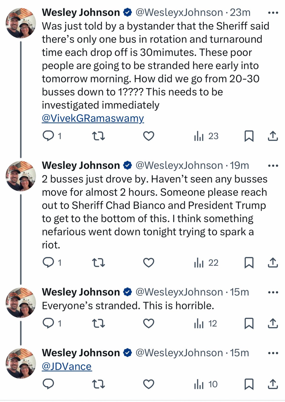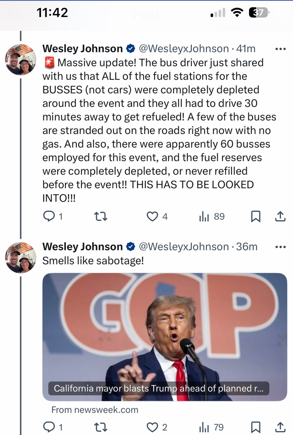 One social media user named Wesley Johnson claimed, without evidence, in a series of deleted posts that "ALL of the fuel stations for the BUSSES (not cars) were completely depleted" and they had to "drive 30 minutes away to get refueled!"