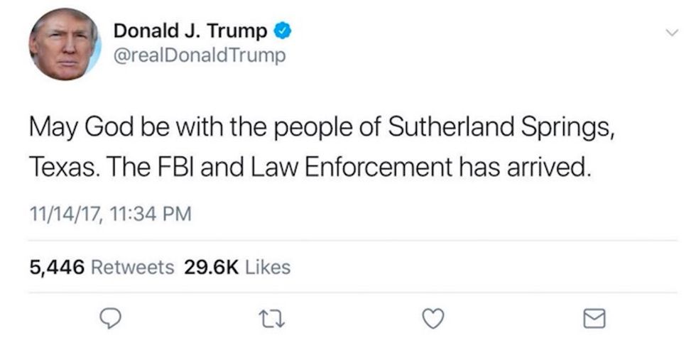 “May God be w/ the people of Sutherland Springs, Texas. The FBI & law enforcement are on the scene. I am monitoring the situation from Japan,” Trump tweeted then.