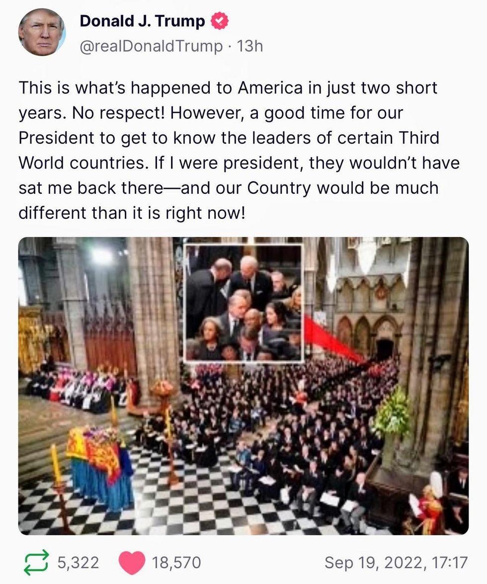 On Monday evening, former Republican POTUS Donald Trump took to Truth Social to proclaim he would have gotten prime seating at the Queen's funeral.