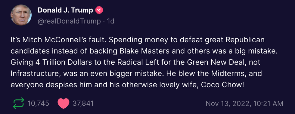 \u201cRepublican Party leader Trump on Sunday pinned the blame for the disappointing midterms on Senate GOP leader Mitch McConnell in a social media post Sunday.\n\n\u201cHe blew the Midterms, and everyone despises him and his otherwise lovely wife, Coco Chow!\u201d Trump wrote.\n\nThis is the GOP.\u201d— Ducker Carlson (@Ducker Carlson) 1668385449