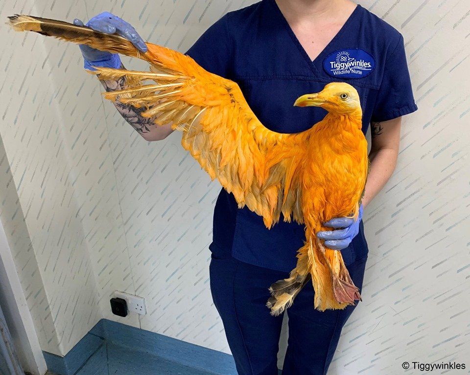 Tiggywinkles Wildlife Hospital recently received a very unique visitor.A seagull came through their doors on July 1st, sporting a bright orange hue.