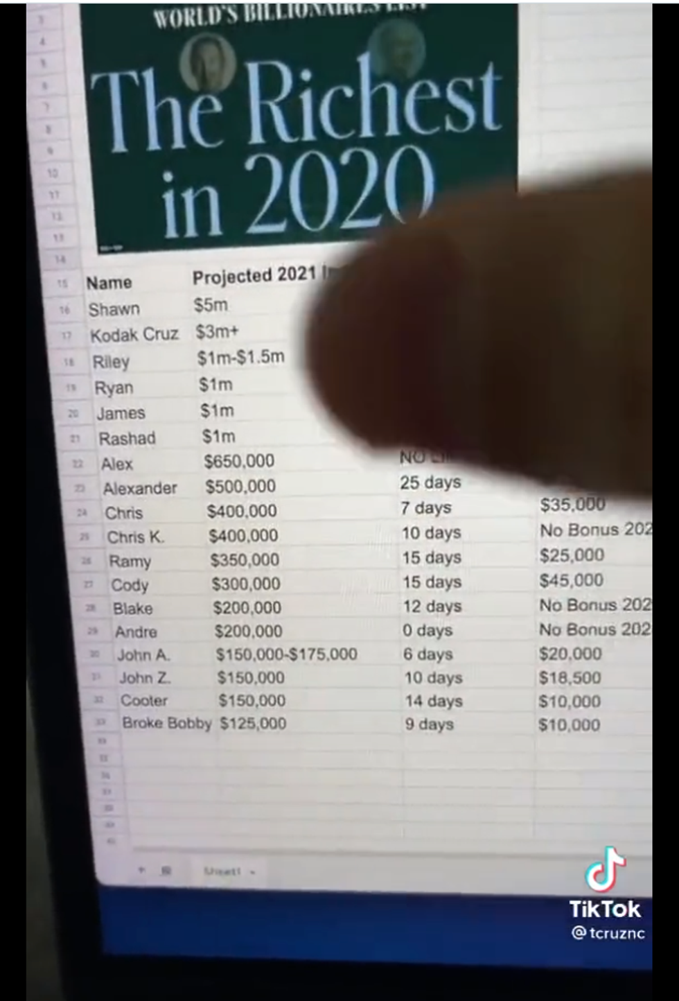"The Richest in 2020" sheet listed 18 members starting with "Shawn," whose projected 2021 income was $5 million, to "Broke Bobby," who was expected to make $125,00 this year.