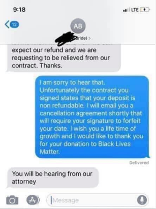 It is on the basis of that bizarre implication that the bride closes her text by demanding a refund and an annulment of their contract.
