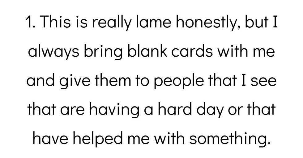 This is really lame honestly, but I always bring blank cards with me and give them to people that I see that are having a hard day or that have helped me with something.