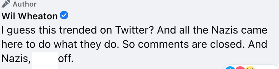 This resulted in Wheaton limiting the comments section of his facebook post, with an accompanying note explaining why.