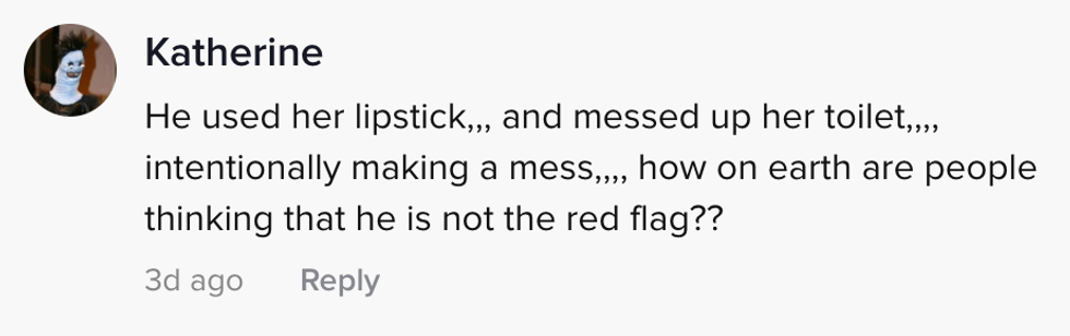 "He asked to use the bathroom before leaving and USED MY LIPSTICK TO WRITE ALL OVER THE SEAT.”