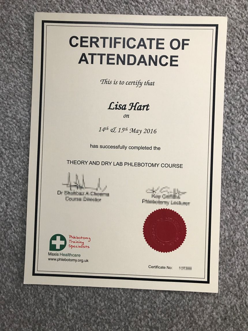 Lisa was then given clinical training, during which she had to take 60 blood samples, which were supervised, in the community, before she could obtain her certificate of compliance.