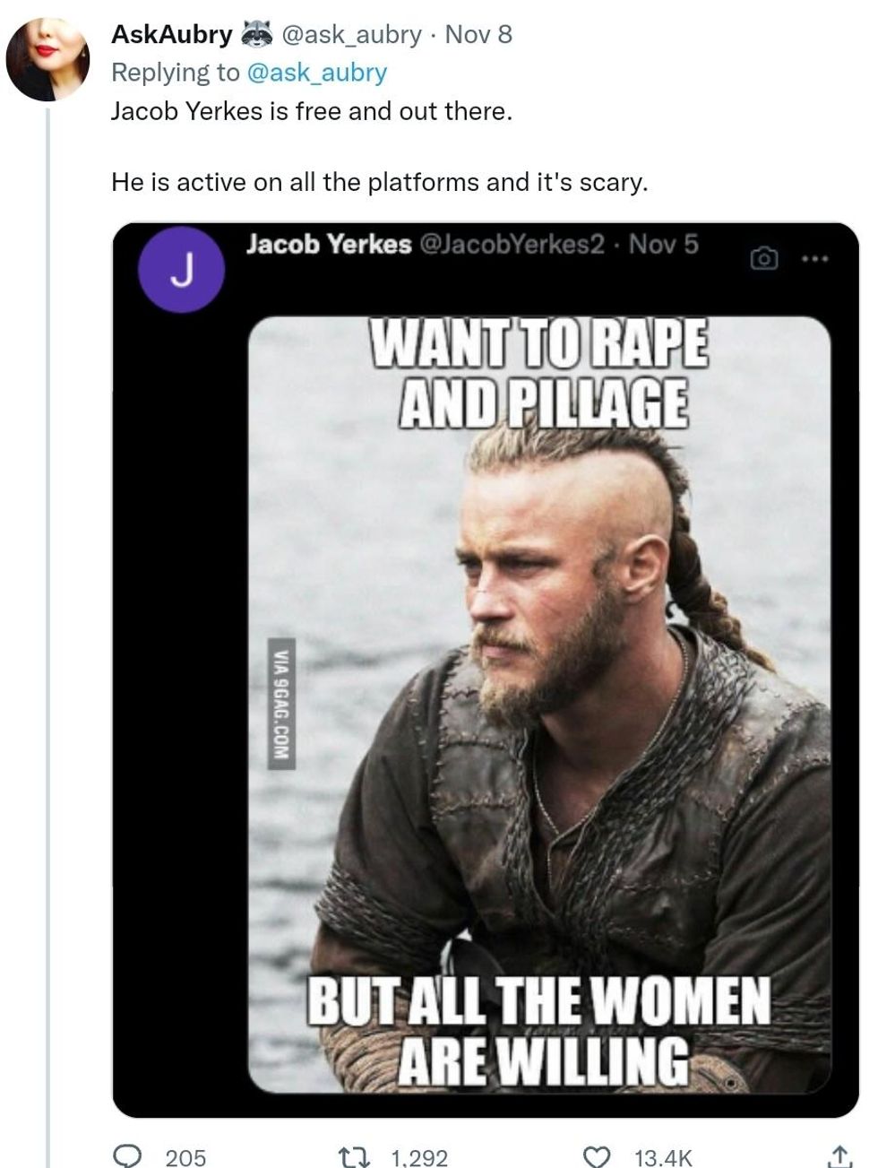 After their joint investigation with the Loudon County Sheriff's Department, LCPD set charges for Yerkes based partially on his own many social media posts claiming women enjoyed his harassment and fantasized about being raped.