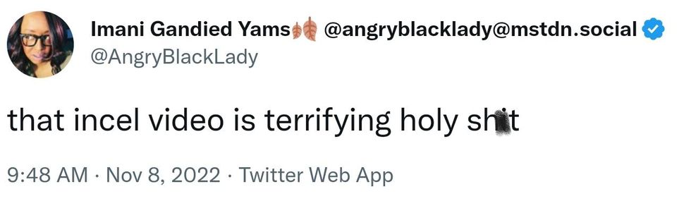 \u201c@SimSim287 @dshwa76 @AngryBlackLady Yes! I didn't watch to the end earlier when dude spoke to the camera. I am gonna make my kids watch this. (Teens) it's people they know or will know.\u201d— Imani Gandied Yams\ud83c\udf42 @angryblacklady@mstdn.social (@Imani Gandied Yams\ud83c\udf42 @angryblacklady@mstdn.social) 1667918911