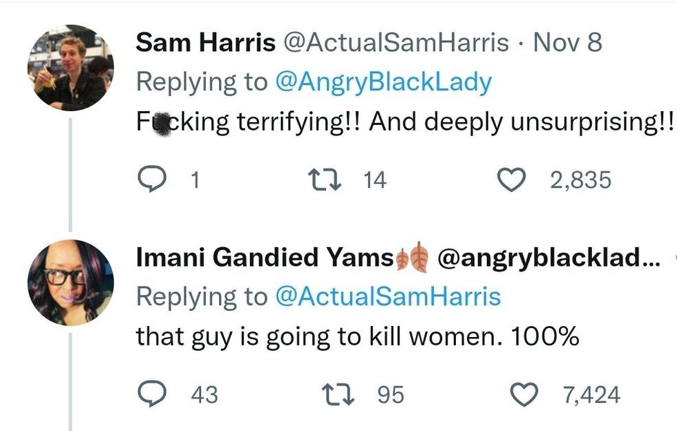 \u201c@Katlamos @AngryBlackLady Dude wants girl. Dude harasses girl at work. They're "former coworkers". Tries to show her a song he wrote, from his car. She drives away, he pursues. Gets a threatening call from her father, and has come to the PD to report him. Doesn't even know his name.\u201d— Imani Gandied Yams\ud83c\udf42 @angryblacklady@mstdn.social (@Imani Gandied Yams\ud83c\udf42 @angryblacklady@mstdn.social) 1667918911