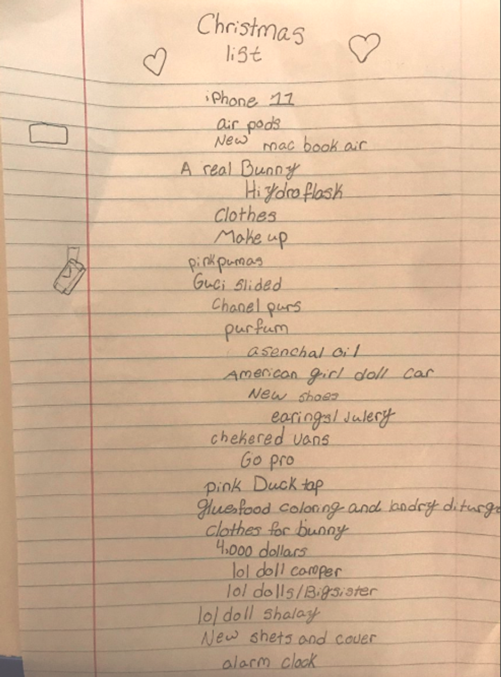 The items range from practical items, like clothes and makeup... to gift ideas that remind us that this is a ten-year-old girl talking, like a live bunny... to the wildly expensive iPhone 11, Air Pods, and Gucci Slides... and even four-thousand dollars.