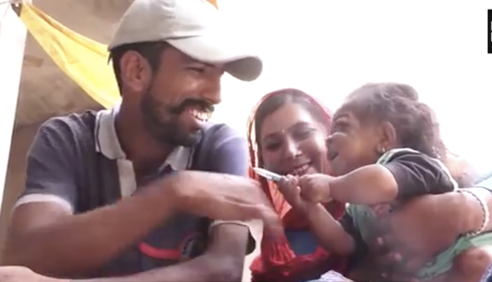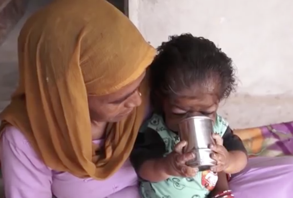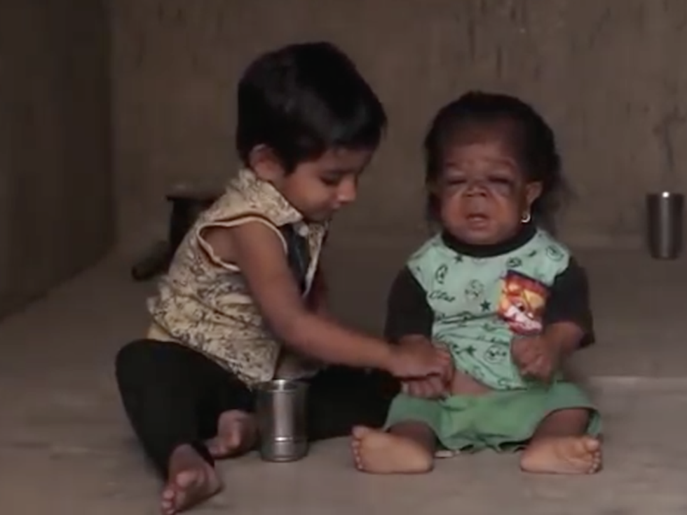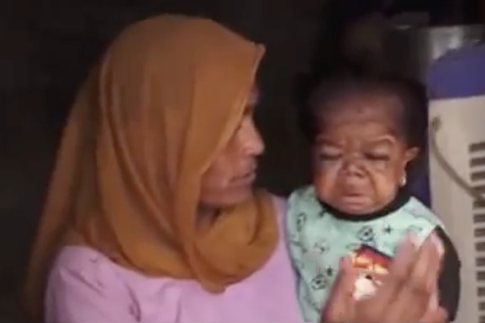He otherwise looks like a healthy 1-year-old, but due to his perpetual stasis as an infant, his sagging skin and swollen legs prevent him from walking. His 42-year-old aunt, Lakhwinder Kaur carries him around.