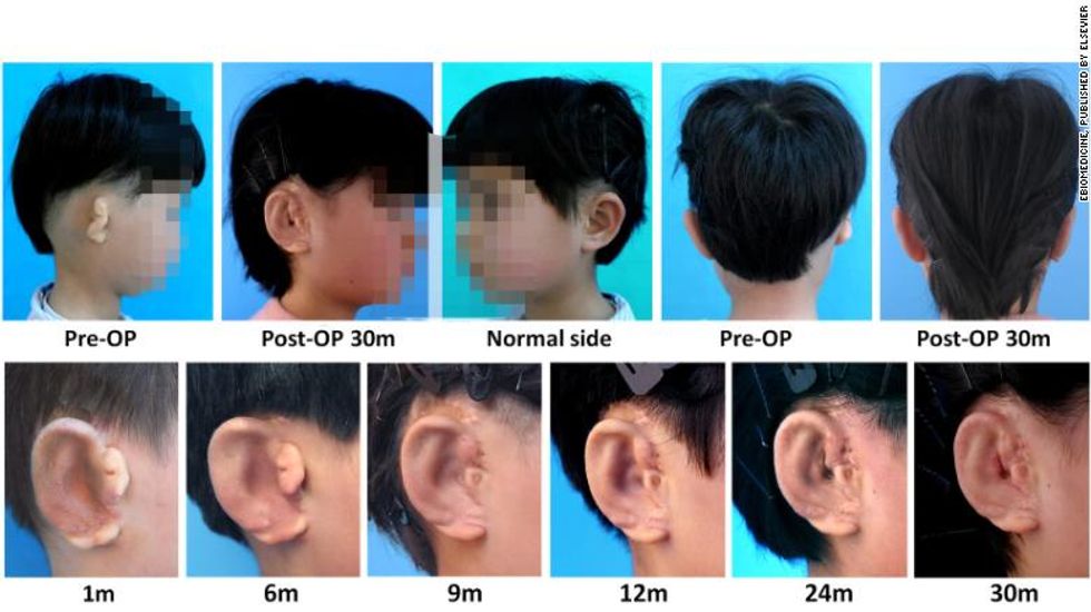 The technique, devised by researchers at Jiao Tong University in Shanghai and published last month in the journal EBioMedicine, involves creating a biodegradable 3D mold of the child’s unaffected ear. The patient’s own cartilage cells are then inserted into tiny holes that cover the mold; over the course of about 12 weeks, the cartilage cells begin to grow in the mold’s shape, as the mold breaks down. The ear can then be transplanted onto the patient.
