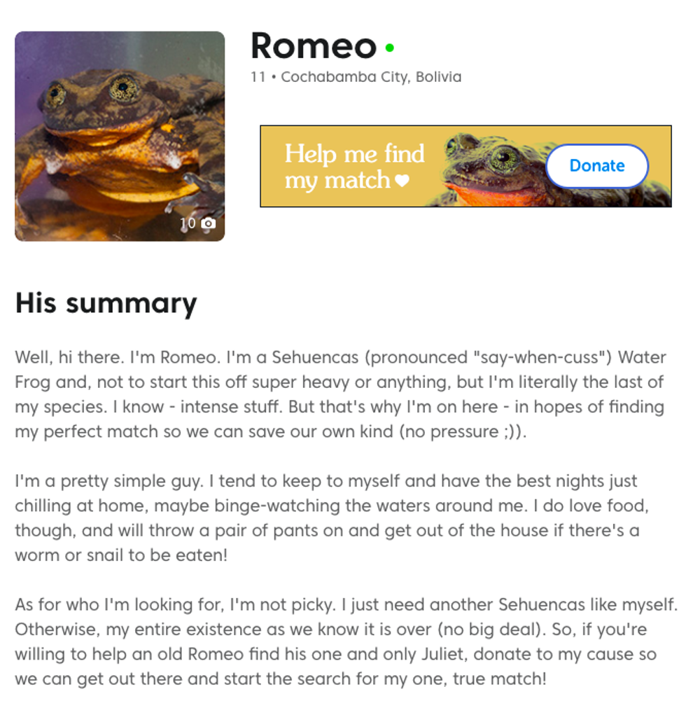 The scientists had to get creative to raise awareness of the species' plight, at one point creating a Match.com dating profile for the lonely frog: