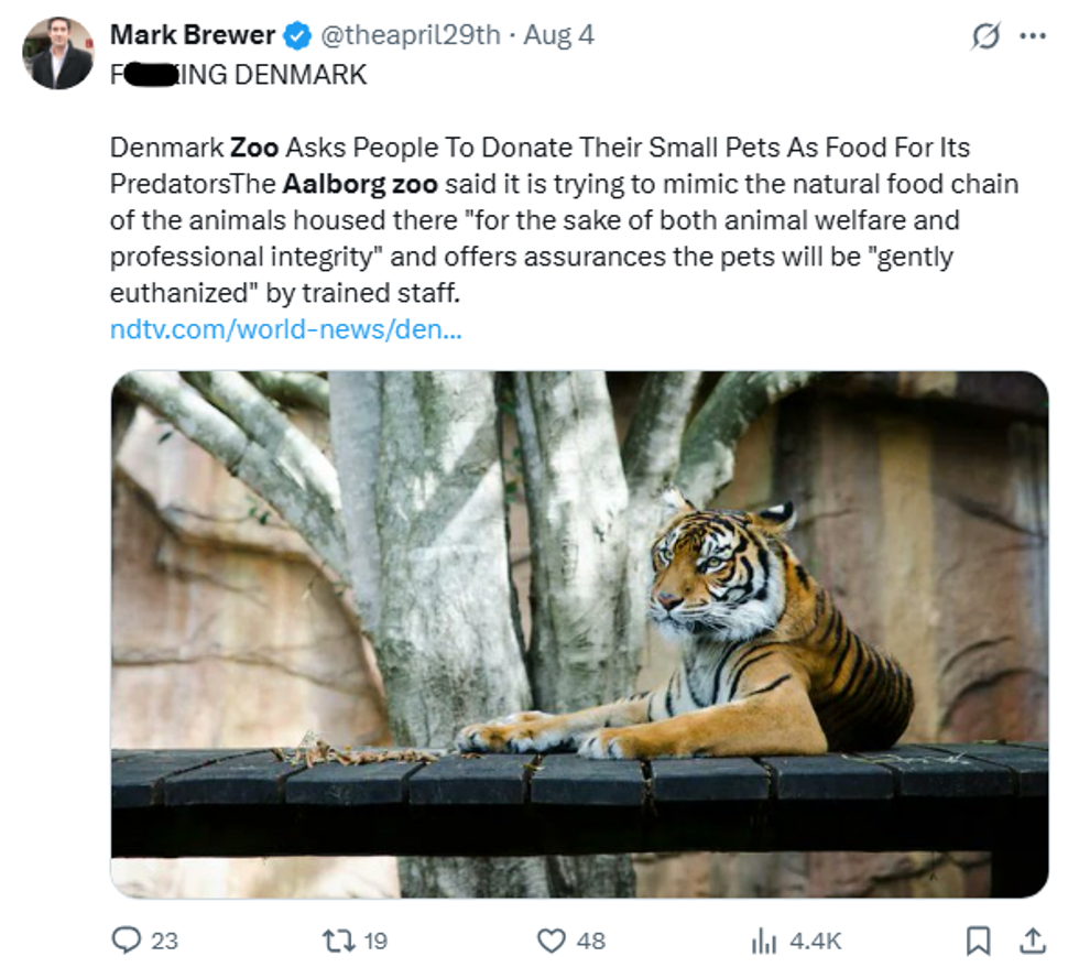 Aalborg Zoo in Denmark is facing serious backlash this week after putting out a public request for "unwanted animals" that they can euthanize and then feed to their predatory animals, primarily their wild cat population.