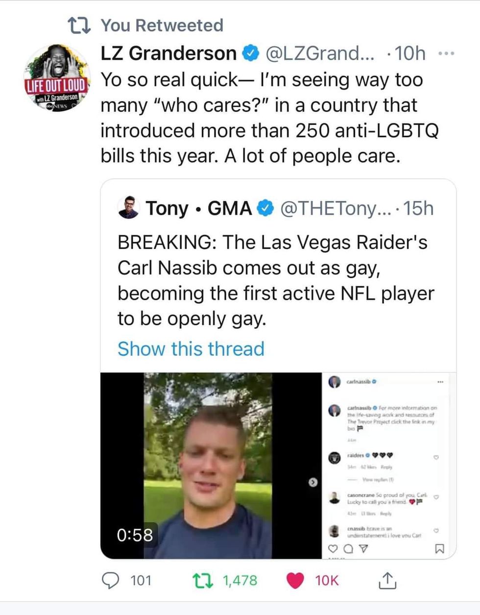 I\u2019m so happy Carl feels safe to live his truth as an NFL player. But even more importantly, he just helped countless other people feel just a little bit safer to live theirs. That\u2019s leadership.\nhttps://twitter.com/bleacherreport/status/1407095401287589892\u00a0\u2026— Zach Banner (@Zach Banner) 1624377065