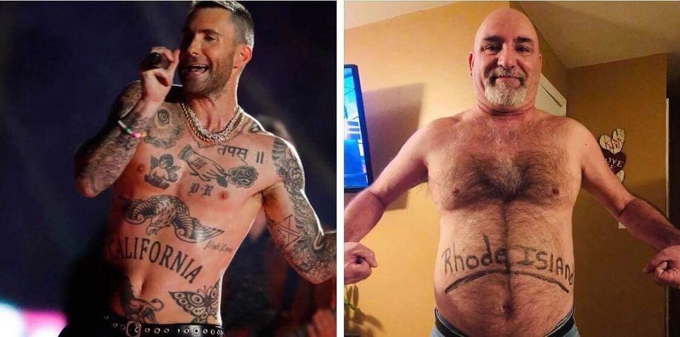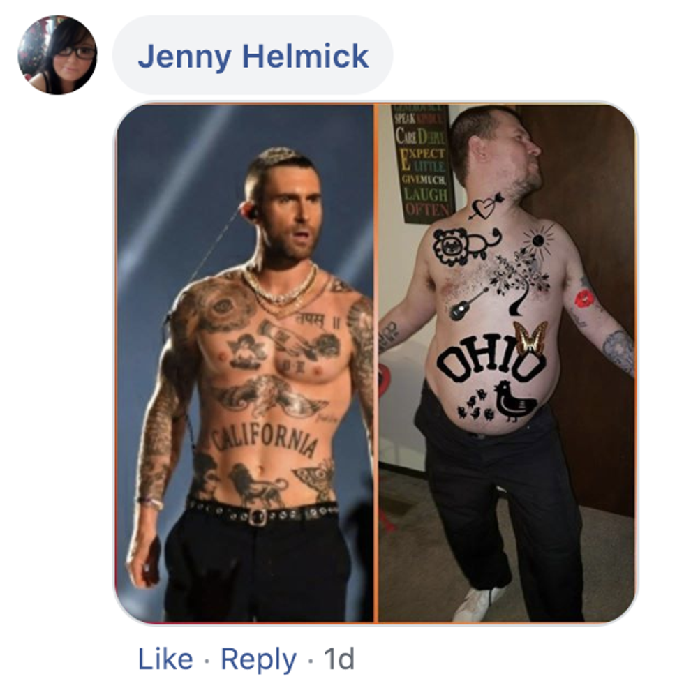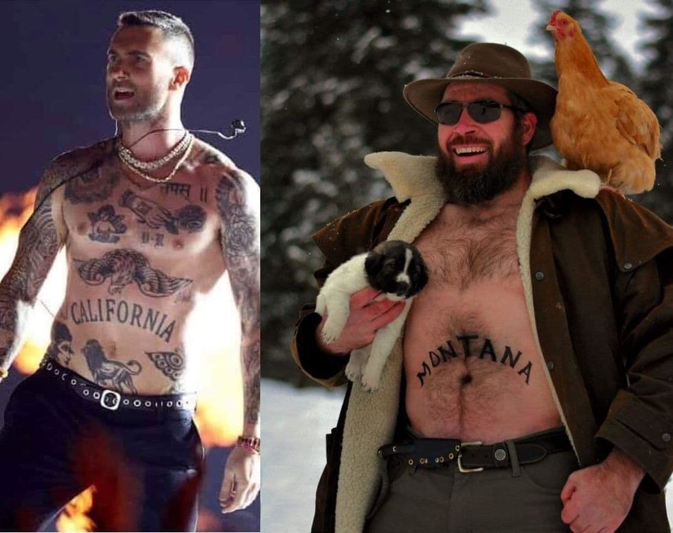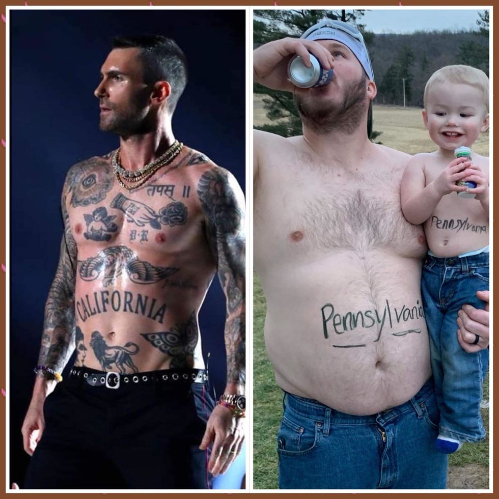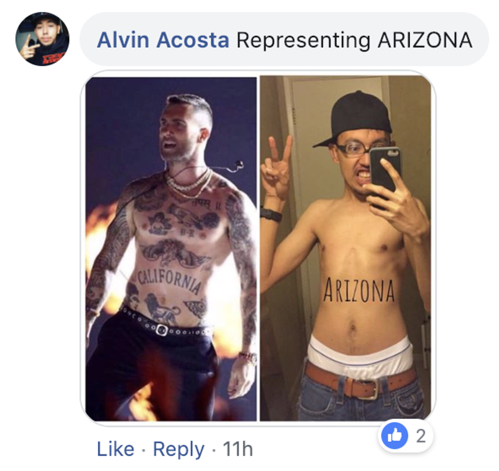 On SuperBowl Monday (if you will), Delaney posted some side-by-side pictures of a shirtless Levine along with other men with their home state proudly emblazoned on their chests.