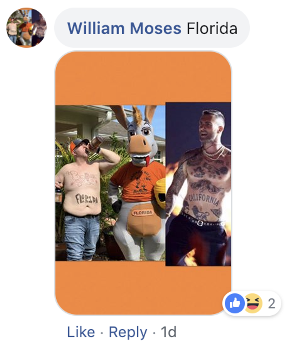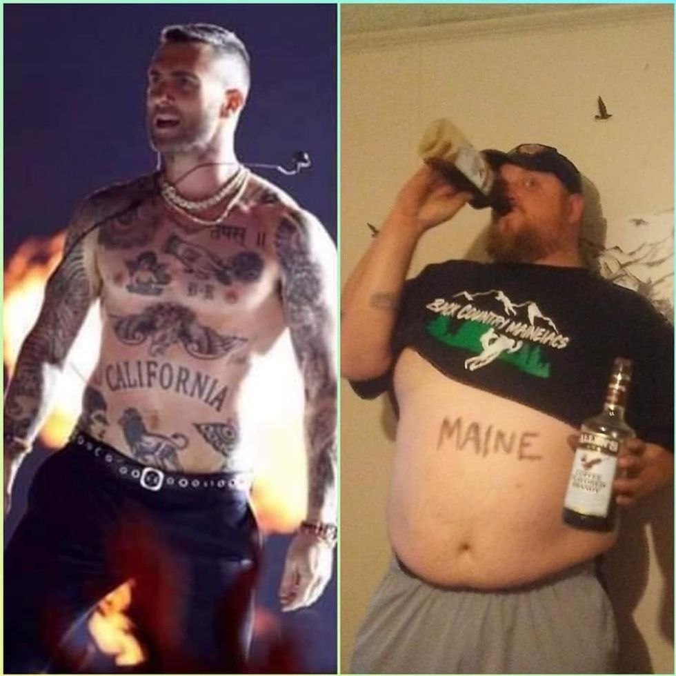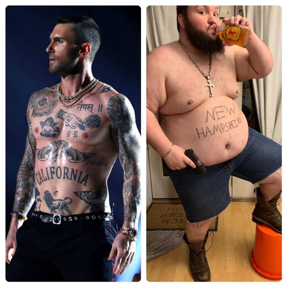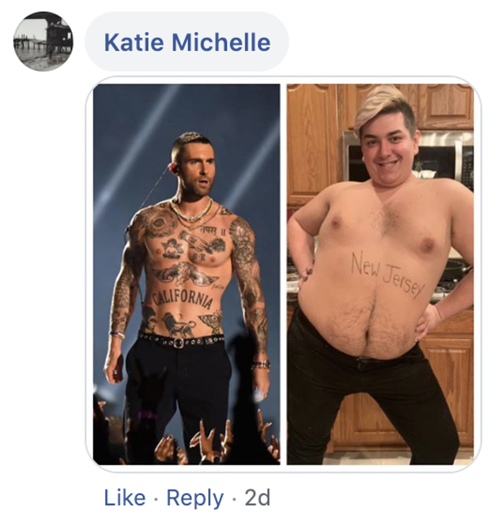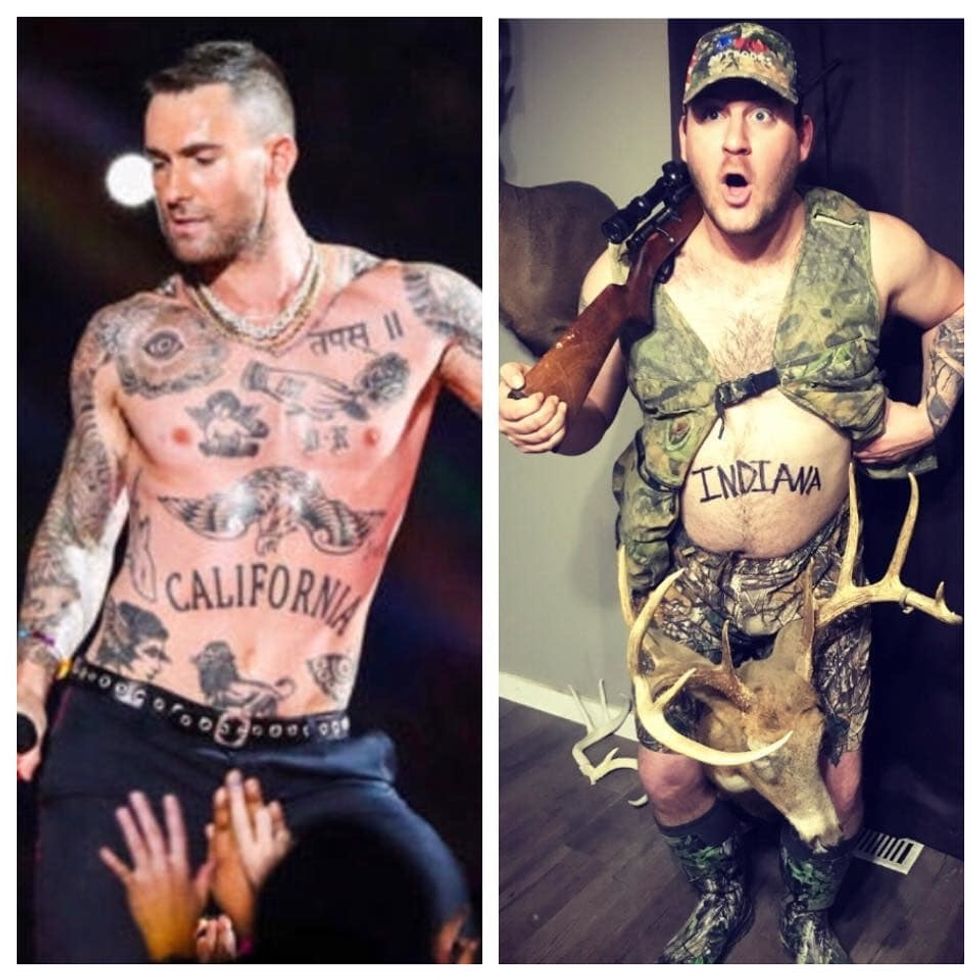On SuperBowl Monday (if you will), Delaney posted some side-by-side pictures of a shirtless Levine along with other men with their home state proudly emblazoned on their chests.