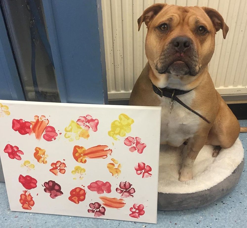 “Sarah asked me and Bumble to meet her in one of the kennels at work, and when we got there, she'd set up this huge sheet of paper and some non-toxic paints. Bumble put her paws in the paint and walked around, leaving this pawprint pattern. It's not exactly neat, but that makes it all the more special."