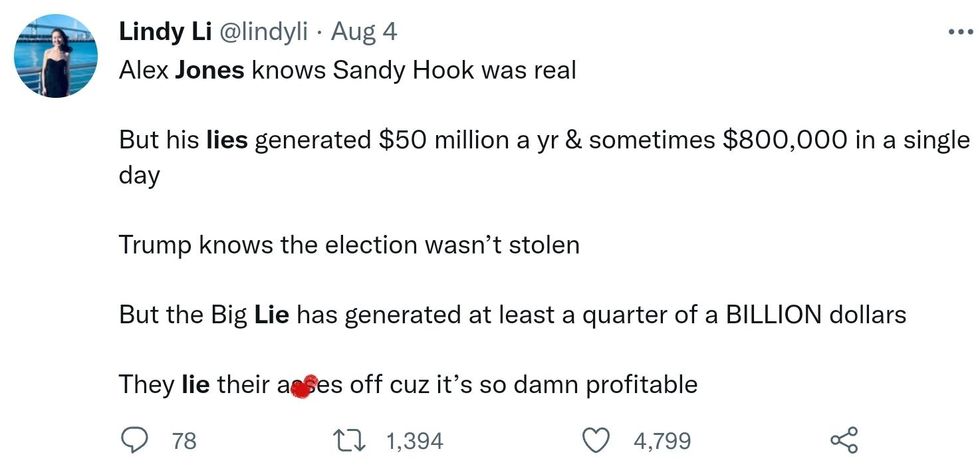 \u201cAlex Jones made millions on his lies and will continue if they don\u2019t \nstop him! \ud83e\udd2c\u201d— Ann (@Ann) 1659728158