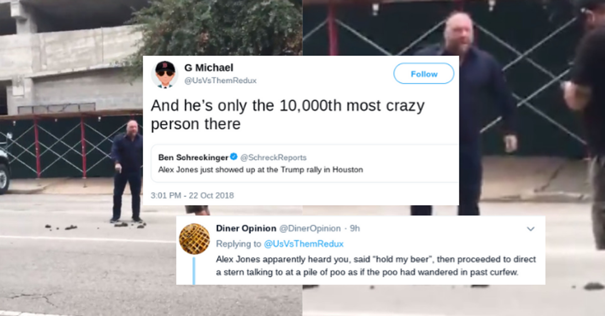 Alex Jones was filmed shouting at a pile of excrement on the street outside a Republican rally in Texas.