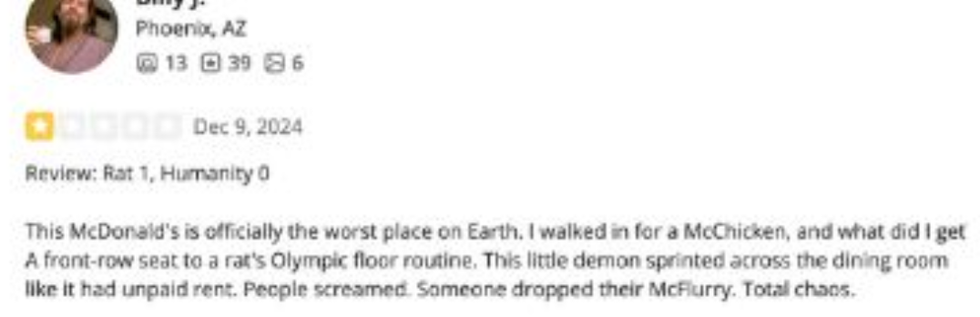 "I walked in for a McChicken. And what did I get? A front-row seat to a rat's Olympic floor routine."