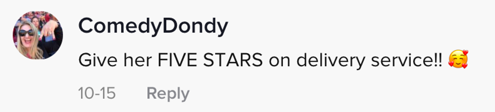 The original poster, @pinkieberg, said in a follow-up video she gave the deliverywoman as many merit badges in her feedback section as was humanly possible, though it did not let her leave a comment.