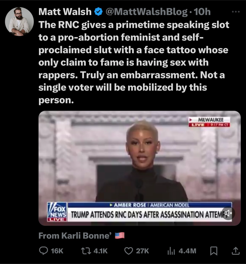 In one tweet, prominent far-right commentator Matt Walsh lambasted the RNC for giving a "prime-time" spot to Rose, whom he referred to as a "slut...whose only claim to fame is sleeping with rappers."