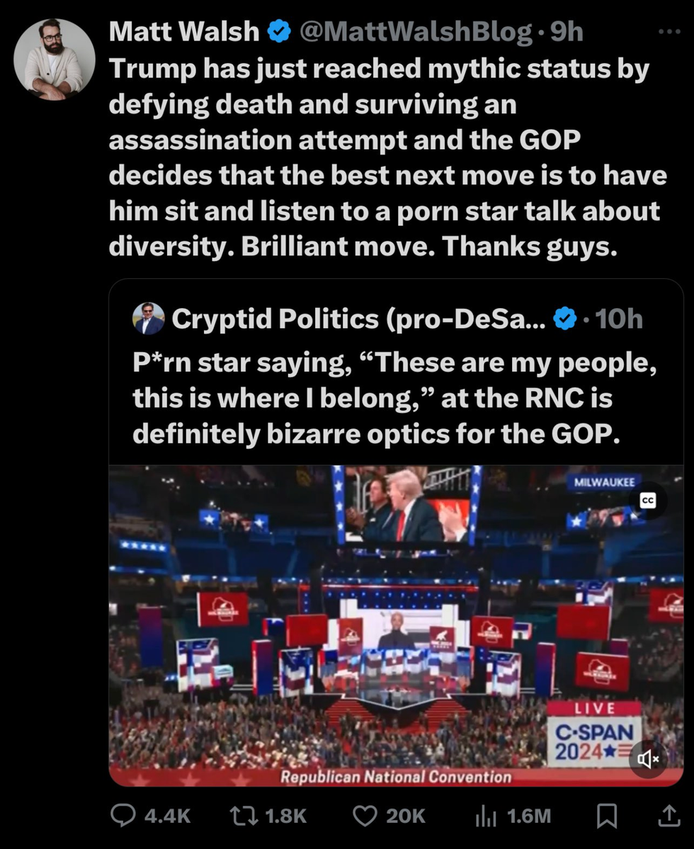 In another, he excoriated the RNC for following up Trump's survival of an assassination attempt by forcing him to listen to "a porn star talk about diversity" (Rose is a prominent OnlyFans creator).
