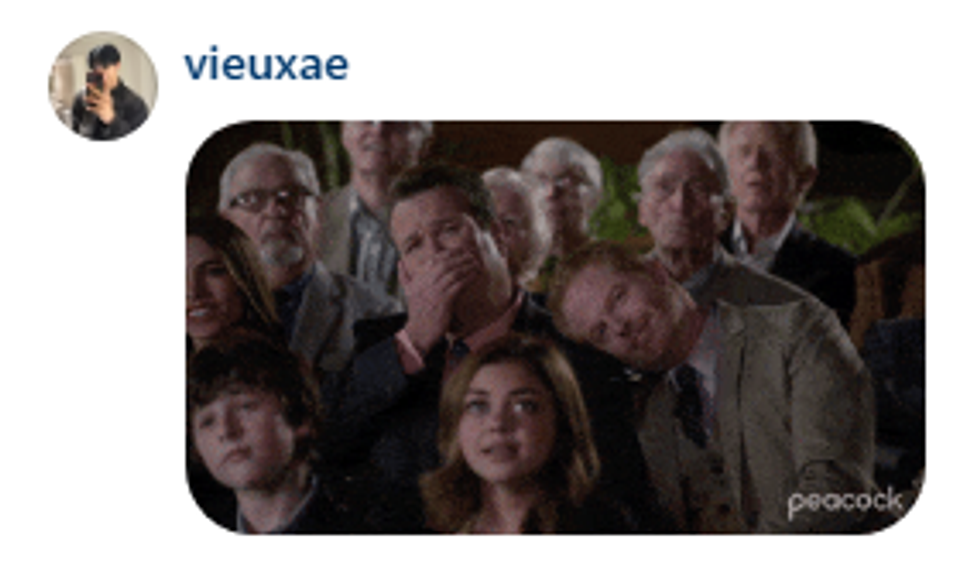 Anderson-Emmons appears smiling before the camera while the audio from the chaotic restaurant scene plays in the background. Vergara can be heard telling Lily that she is Vietnamese, and Anderson-Emmons then lip-syncs her own part about being gay instead.