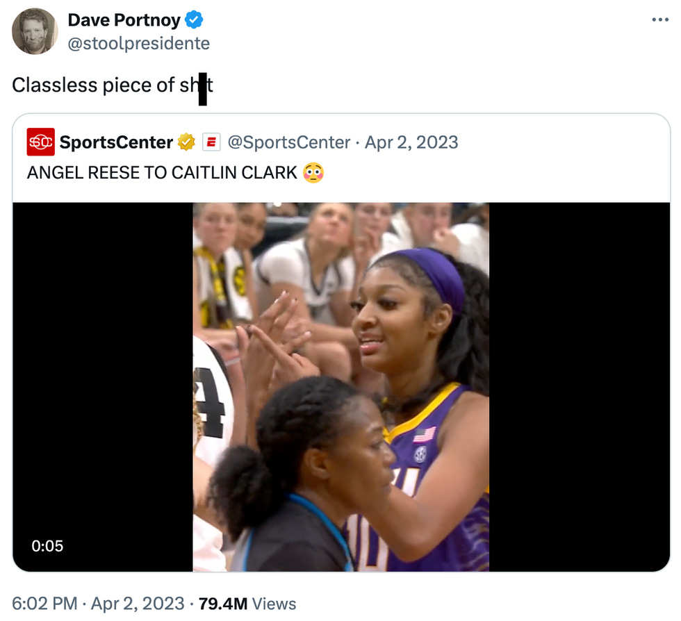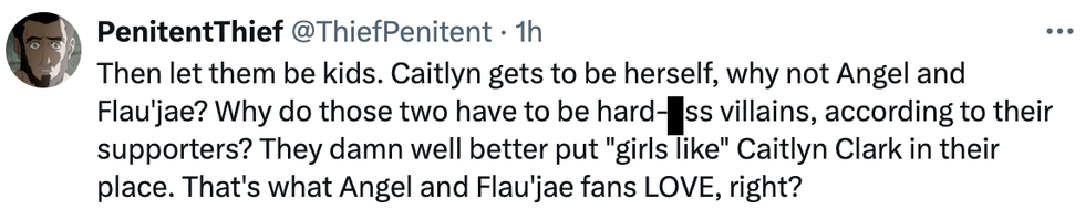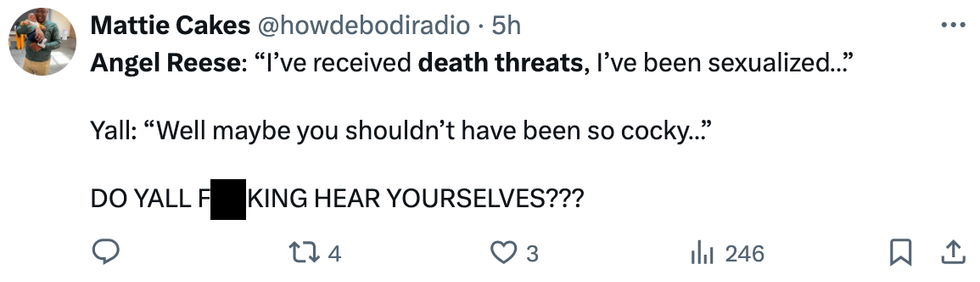 Angel Reese being the \u201cbad guy\u201d on the court doesn\u2019t give grown men the right to commit crimes against her. Death threats, sexual harassment, and utter depravity aren\u2019t just accepted parts of fanhood. Just say you\u2019re ok with men hating Black women and stand in your truth.— (@)