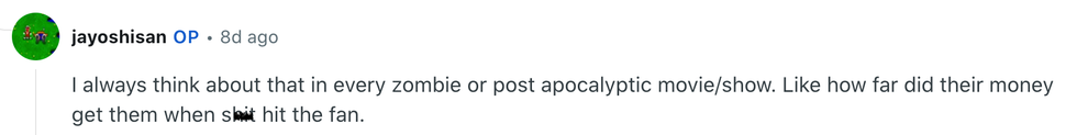 Another commenter pointed out one of the true losses of the zombie apocalypse in the show.