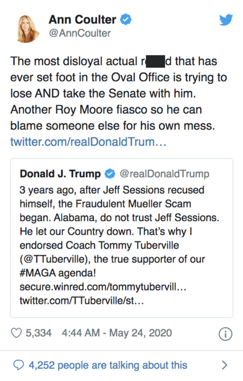 Coulter was responding to Trump's attacks on his former Attorney General, Jeff Sessions, who is currently fighting to unseat Senator Doug Jones (D-AL). Jones won against the Republican candidate, accused child molester Roy Moore, in a special Senate election in 2018.