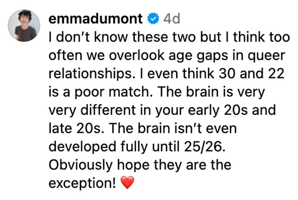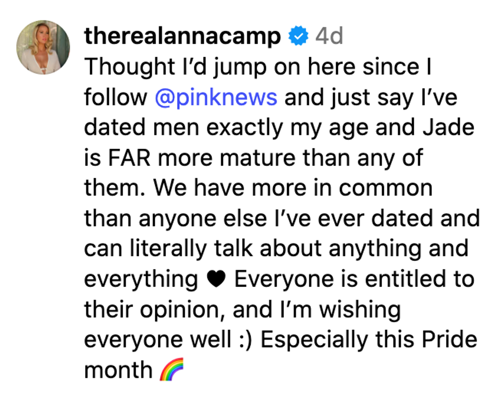 This difference in ages raised some eyebrows in comments on a post by Pink News about the couple, to the point that Camp felt she needed to step in and clear the air.