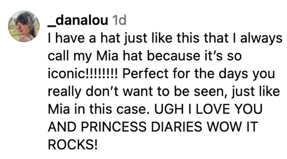 Hathaway wore a similar style hat, but in gray, for a scene from the 2001 coming-of-age drama The Princess Dairies, where she played Mia Thermopolis, the sole heir to the throne in the kingdom of Genovia.
