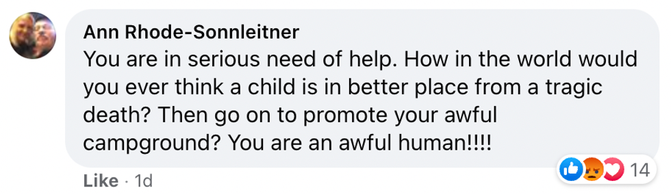 At the center of the controversy is Ann Retzlaff, the owner of Annie's Campground in Gresham, Wisconsin. After the child drowned on Friday night, Retzlaff took a moment to pen a lengthy post that included advertising her campground.