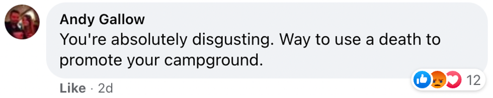 The now edited Facebook message, which announced the child's death and later moves on to advertise vacancies at the campground, was called insensitive self-promotion by several commenters on Facebook.