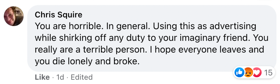 "As I now have time to review some of these horrible, hateful, careless posts from miserable people, and probably from people who were not here, who did not witness anything surrounding the tragedy this weekend, who would not normally camp anyway, this added message is for you:"