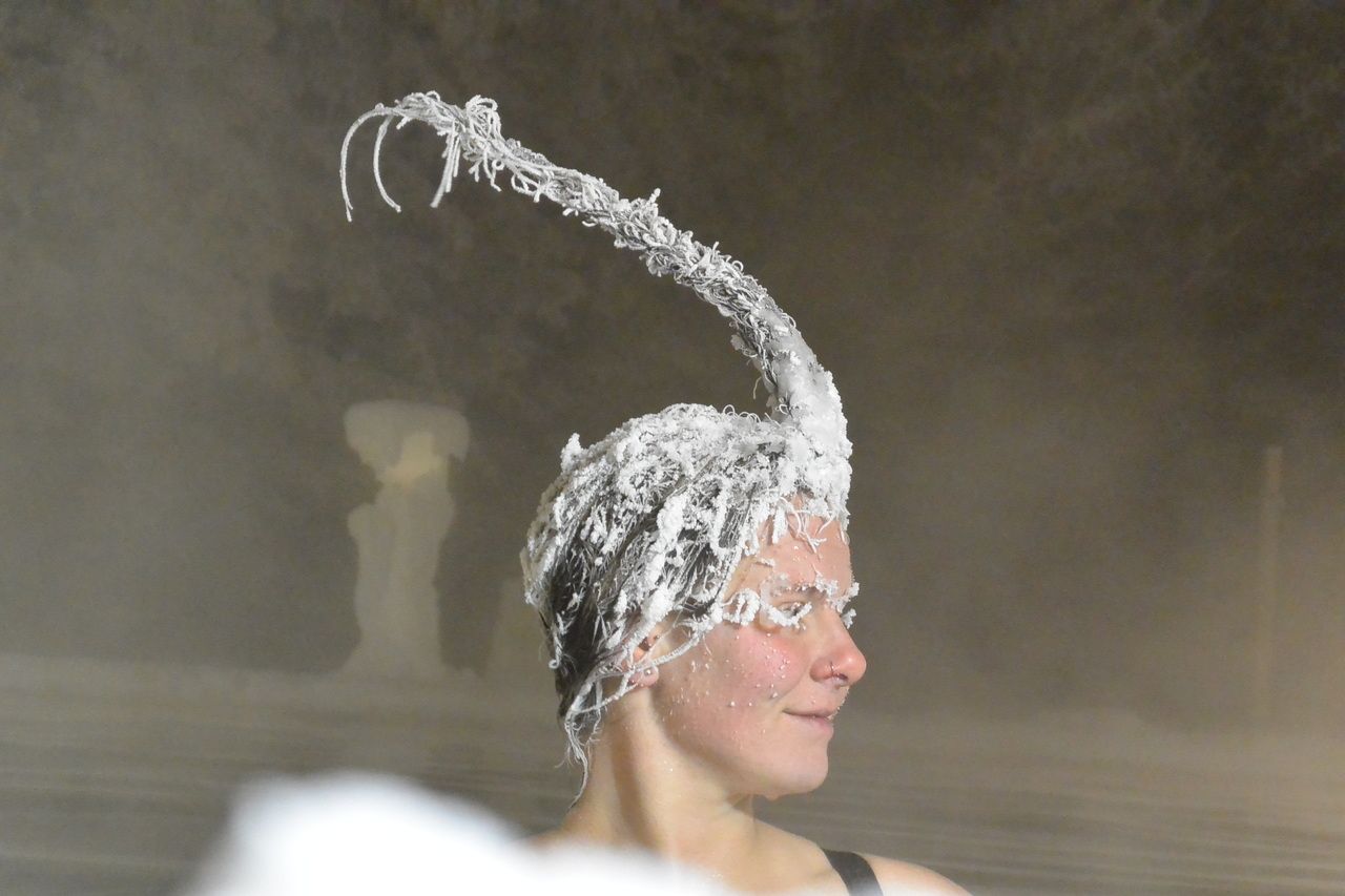 All countries have interesting traditions. Some roll cheese, others freeze their hair. Visitors to the Takhini Hot Springs in Yukon Province, Canada, have found an inventive way of letting their hair down, or, to be more accurate, putting it up.