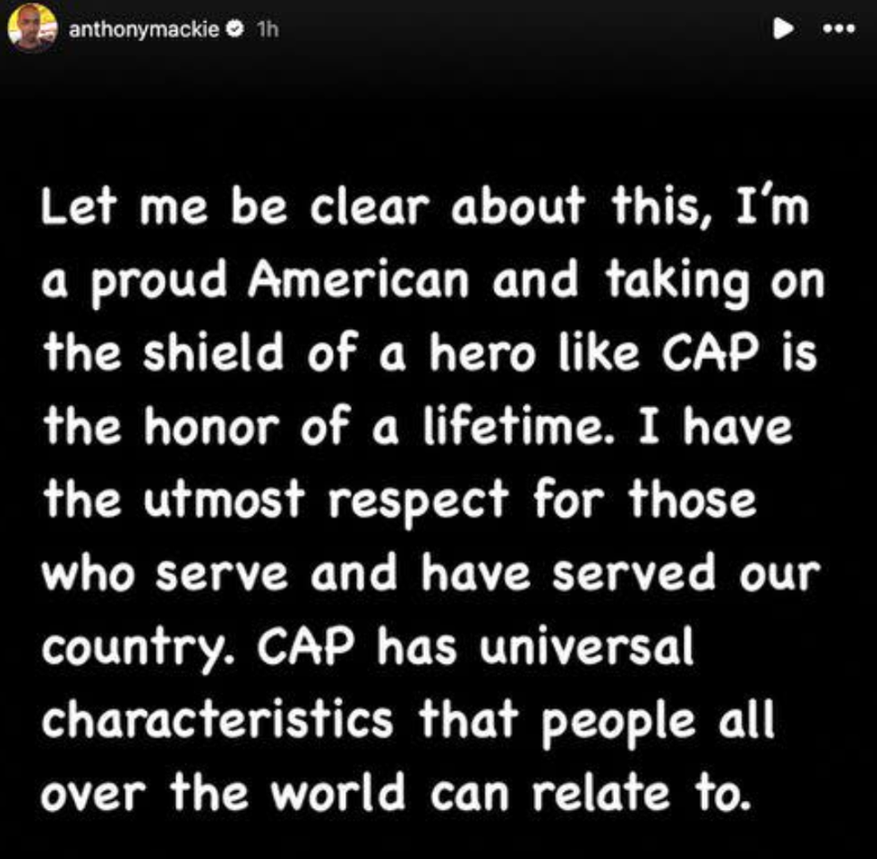 The 46-year-old American actor, who is reprising his Marvel character Sam Wilson–a.k.a. Captain America–in the new film, took to Instagram stories to state, "Let me be clear about this, I'm a proud American."