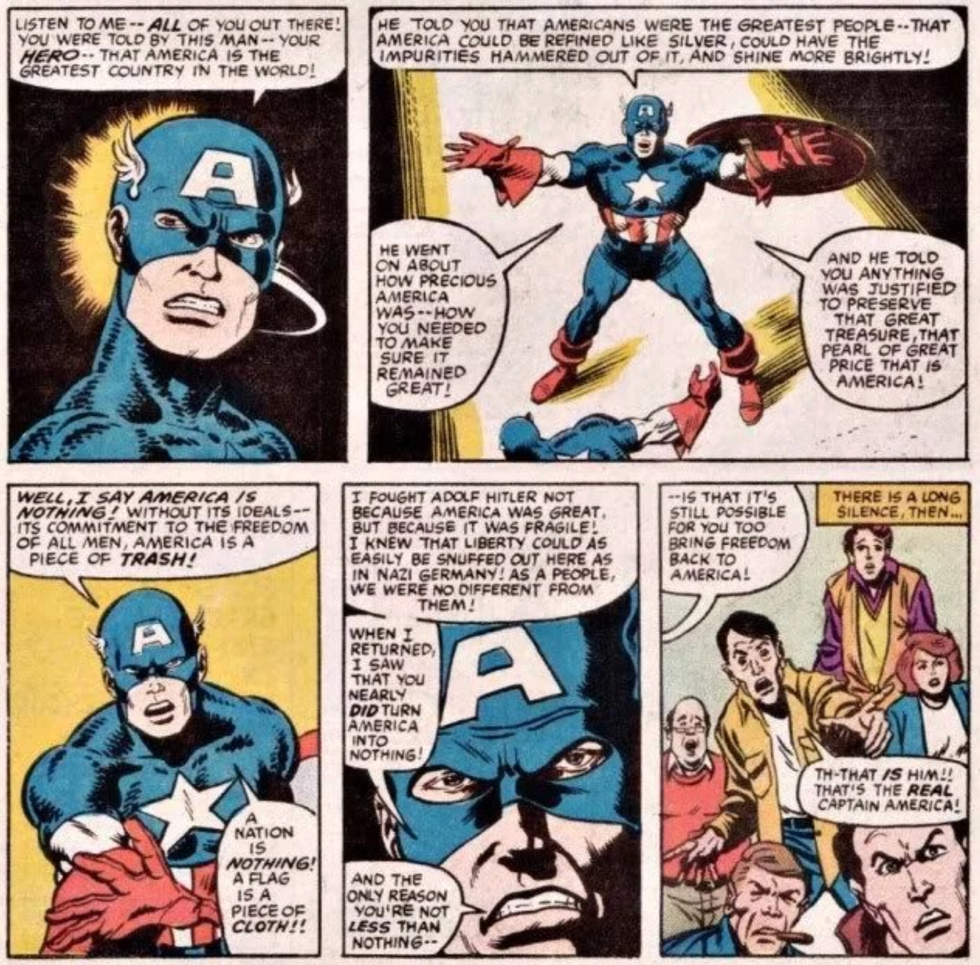 X user @capetosauro shared a screenshot straight from the Marvel comic that aligned with Mackie's view of what Captain America represents, a hero who recognized that "America is nothing. Without its ideals—Its commitment to the freedom of all men, America is a piece of trash!"