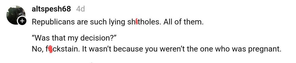 People across social media called out Holtorf’s pro-forced birth stance for what it was—typical Republican "rules for thee, not for me" hypocrisy.