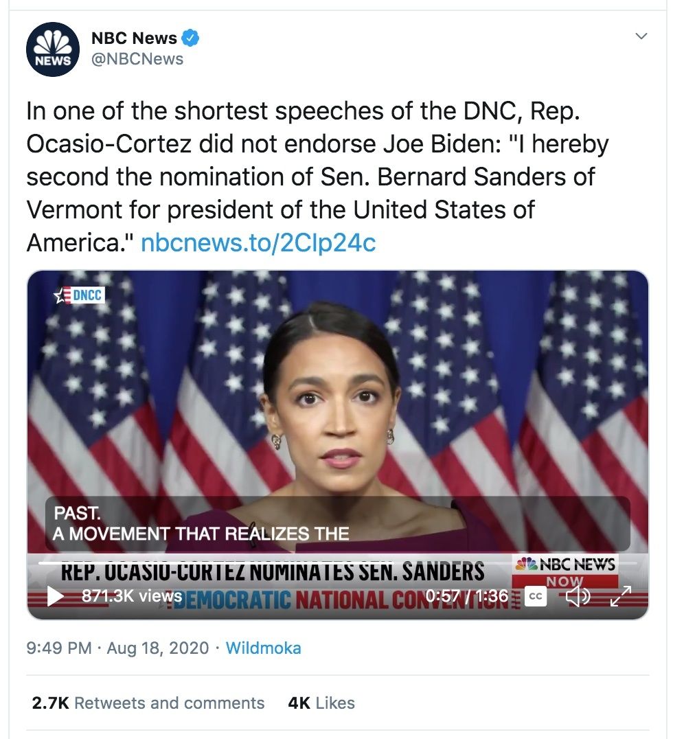 Of course, that didn't stop NBC News from tweeting about AOC's speech as if she had hijacked the convention away from Joe Biden.