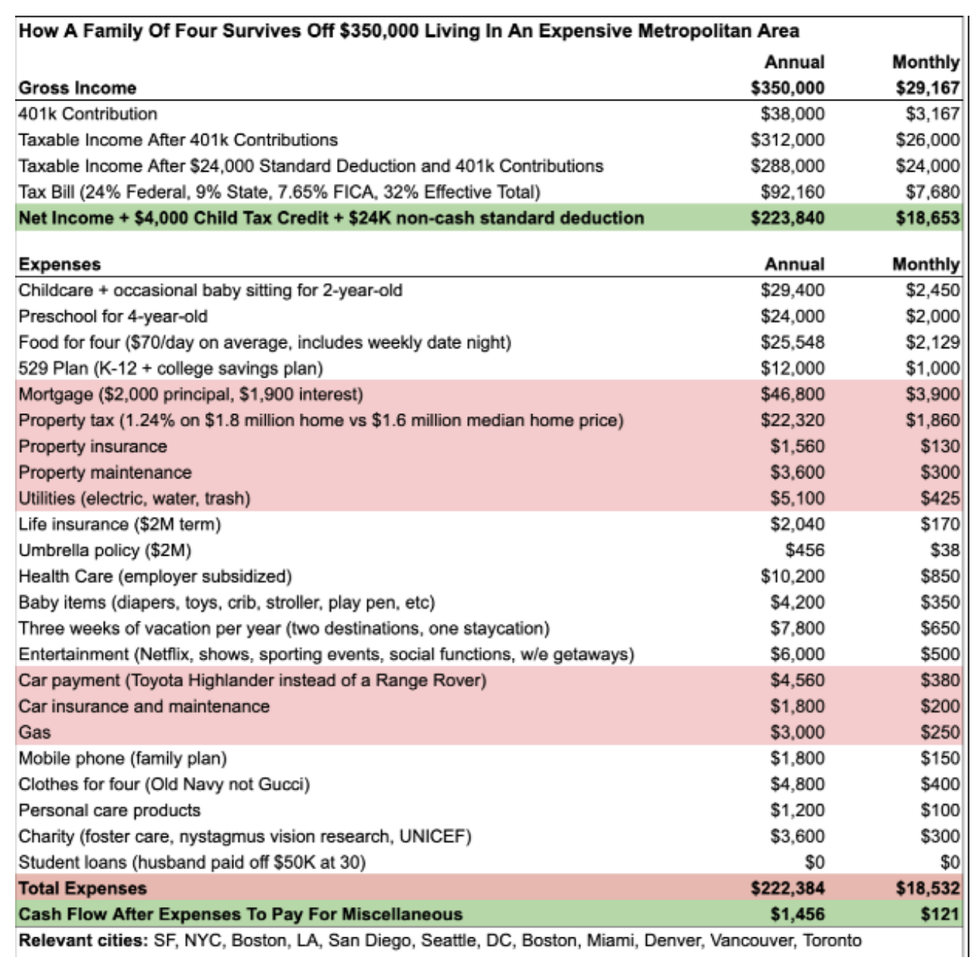 According to Sam Dogen of the Financial Samurai blog, $350,000 salary is barely enough for a family to live comfortably in coastal cities like New York and San Francisco.