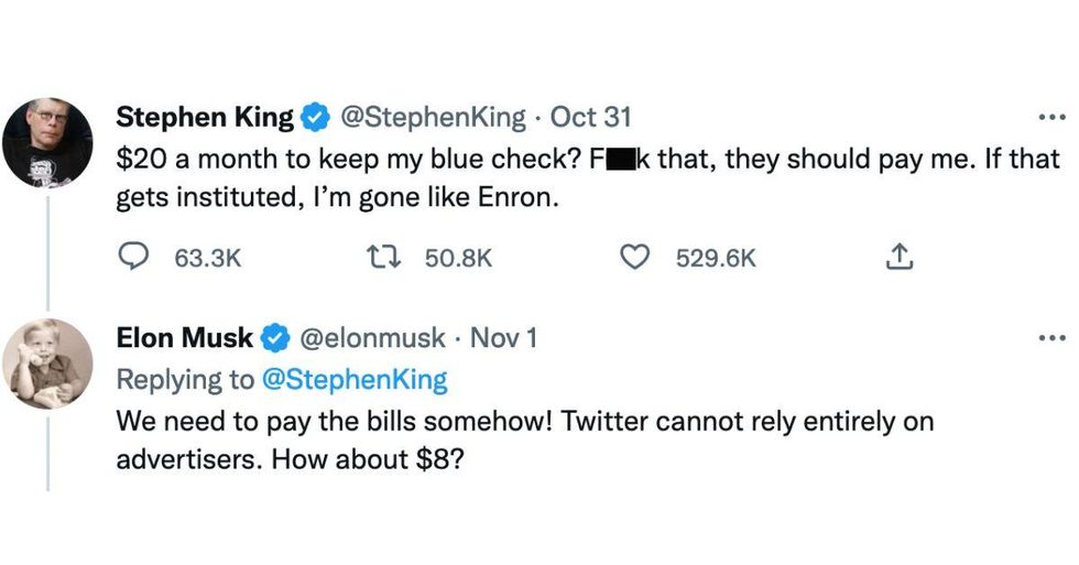 After King tweeted "fu*k that" in response to Musk's proposed $20 charge, Musk began groveling at King to approve a smaller $8 per month charge.