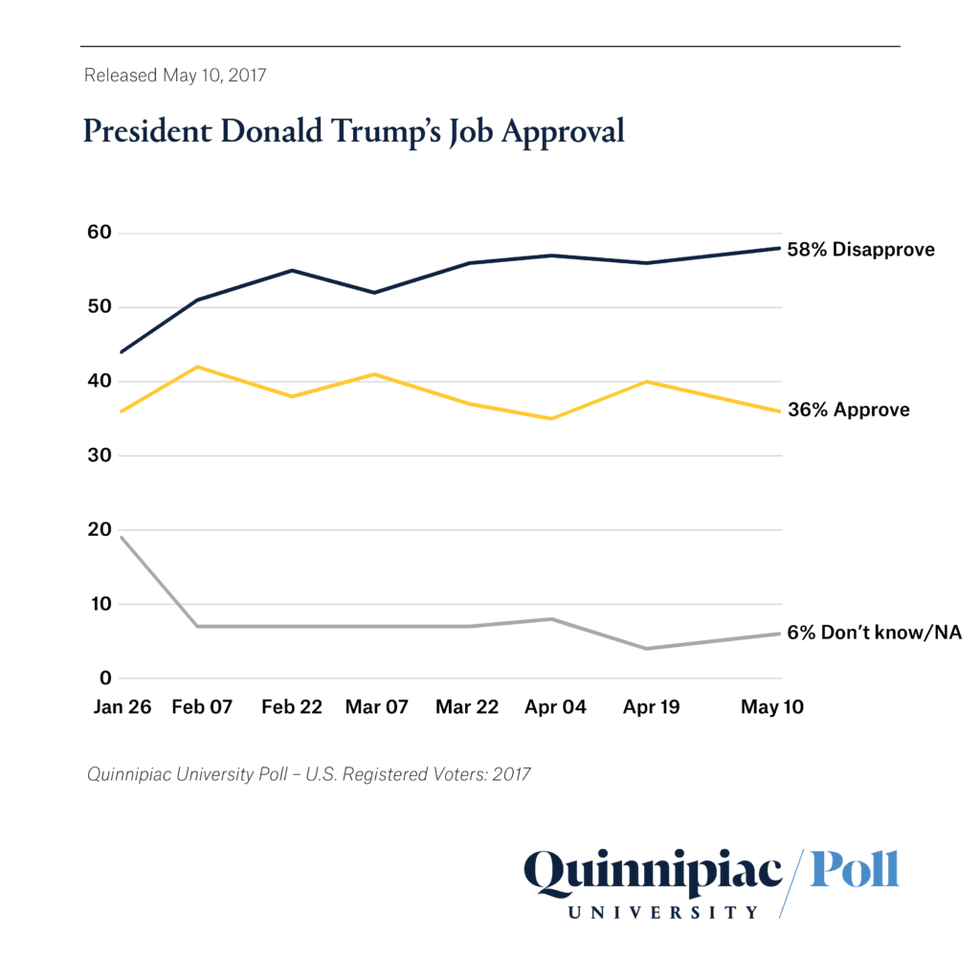 The polling was conducted from May 4-9, so the numbers do not yet reflect the full fall out of the Comey firing and of the resulting increase in criticism from some Republican lawmakers. Even without these, Trump only earned a 36 percent approval rate. Of the voters polled, 58 percent disapproved of the job he is doing.